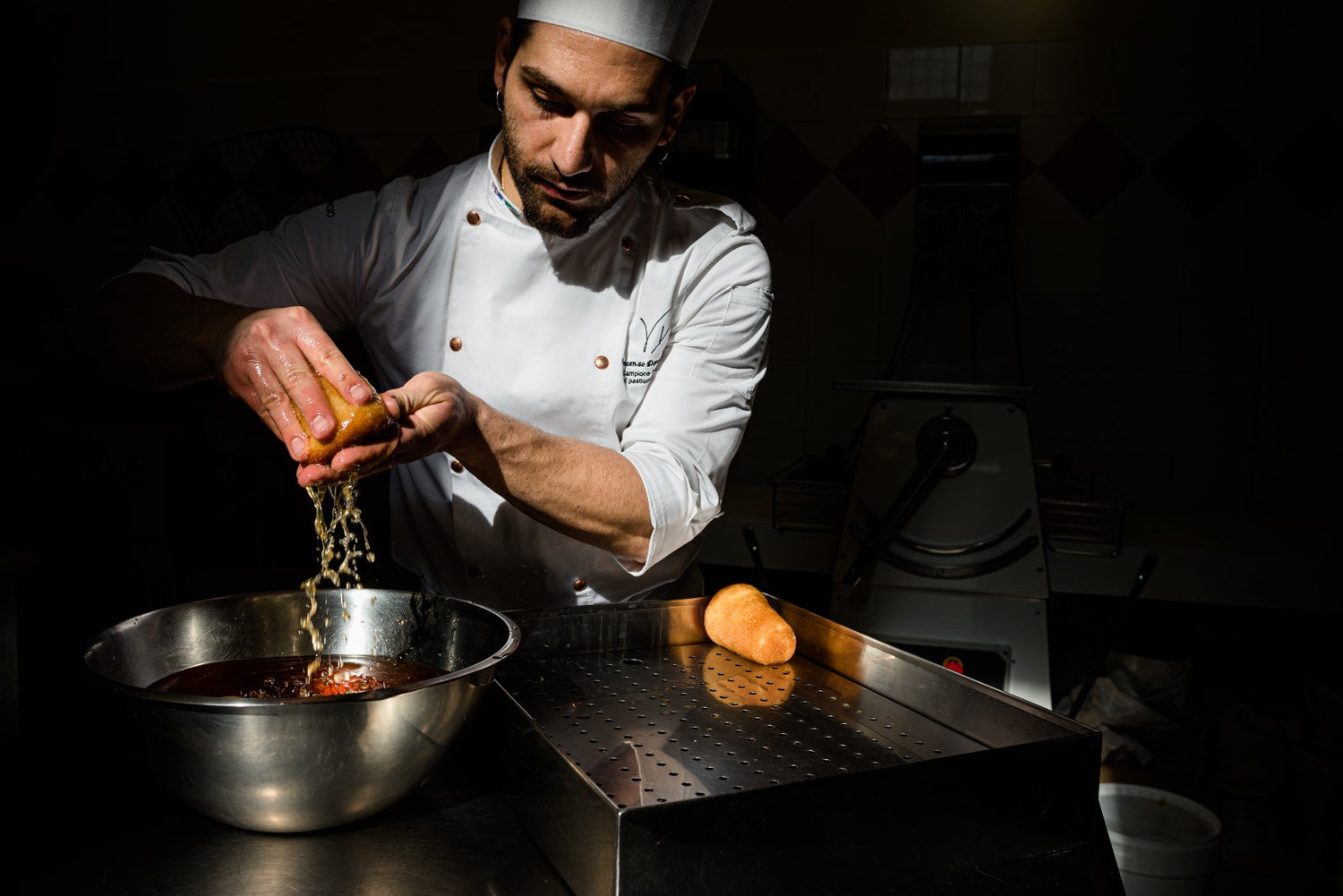 Un altro passaggio fondamentale nella produzione del Babbà è l'inzuppo. In un piccolo contenitore metto del rhum con il quale vado a bagnarlo interamente. Un buon babà lo si vede da come tiene la bagna: il mio, fin quando non lo strizzo, non ne lascia fuori nemmeno un po'.